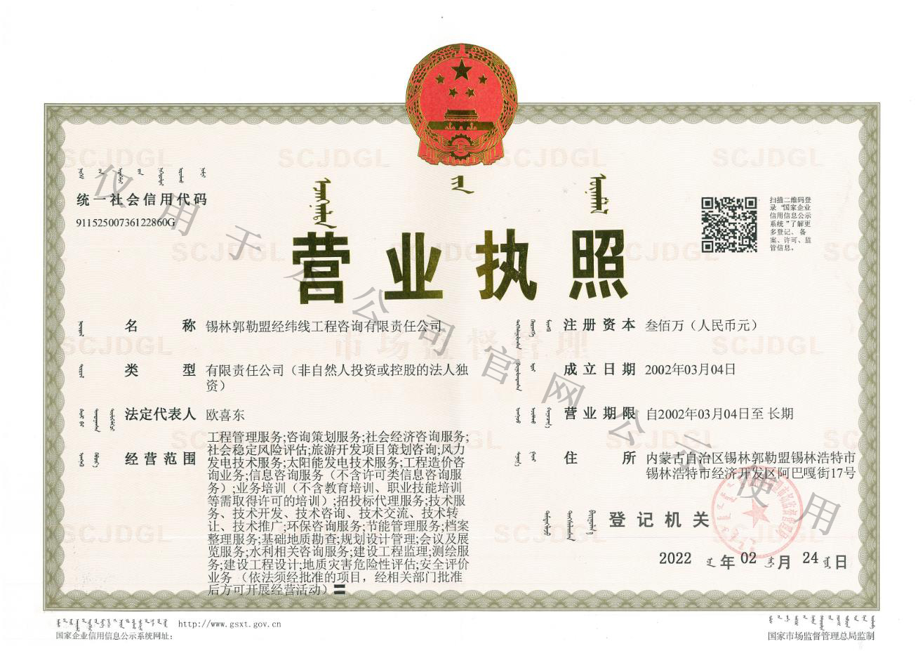 錫林郭勒盟經(jīng)緯線工程咨詢有限責任公司成立于2002年03月04日,注冊資本300萬元,原隸屬于錫林郭勒盟發(fā)展和改革委員會出資的國有獨資企業(yè),于2021年7月正式劃轉至錫林郭勒盟城鄉(xiāng)投資集團。公司具備工程咨詢乙級資信,為內蒙古自治區(qū)工程協(xié)會、內蒙古招標采購協(xié)會常務理事單位。
